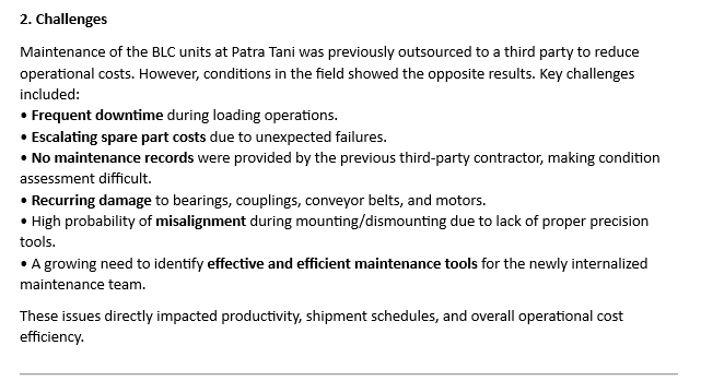 PT. ALP Petro Industry menginginkan sebuah perangkat yang dapat digunakan untuk melakukan alignment shaft dengan baik. PT. CBI diharapkan untuk dapat memberikan rekomendasi alat yang sesuai dengan budget customer, termasuk memberikan pelatihan penggunaan dan aftersales services yang baik.
