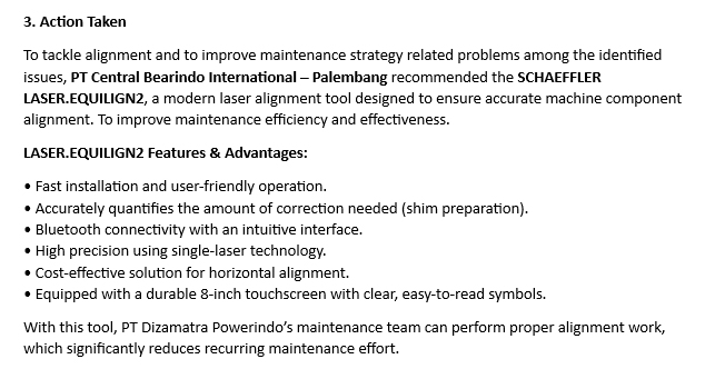 Setelah melakukan pertemuan, survey dan diskusi dengan customer, Solusi yang di tawarkan oleh PT CENTURY BEARINDO INTERNATIONAL adalah alat SCHAEFFLER LASER EQUILIGN. PT CBI juga memberikan training mengenai penggunaan alat kepada pelanggan dengan praktek langsung di lapangan.