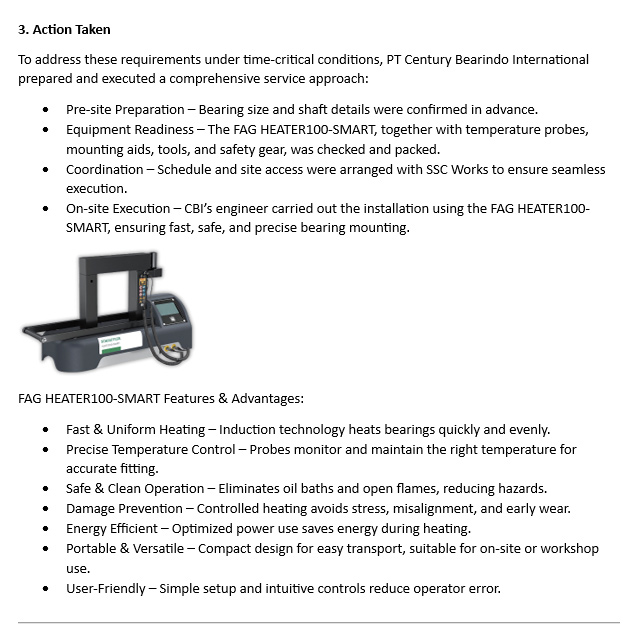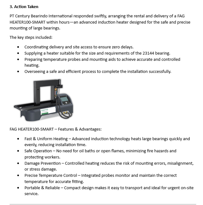 Solusi yang di tawarkan oleh PT CENTRAL BEARINDO INTERNATIONAL adalah menggunakan heater HEATER20 BASIC. Metode pemasangan bearing yang lembut dan aman, dicapai melalui pemanasan induksi yang memastikan bahwa bearing yang selalu disiapkan dan dipasang pada suhu ideal untuk pemasangan yang benar secara teknis.