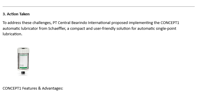 Understanding PT Multi Spunindo Jaya's need to optimize their lubrication process, PT Century Bearindo International (CBI) stepped in to provide a cutting-edge solution: the OPTIME C1 Smart Lubricator from Schaeffler. CBI's approach involved: